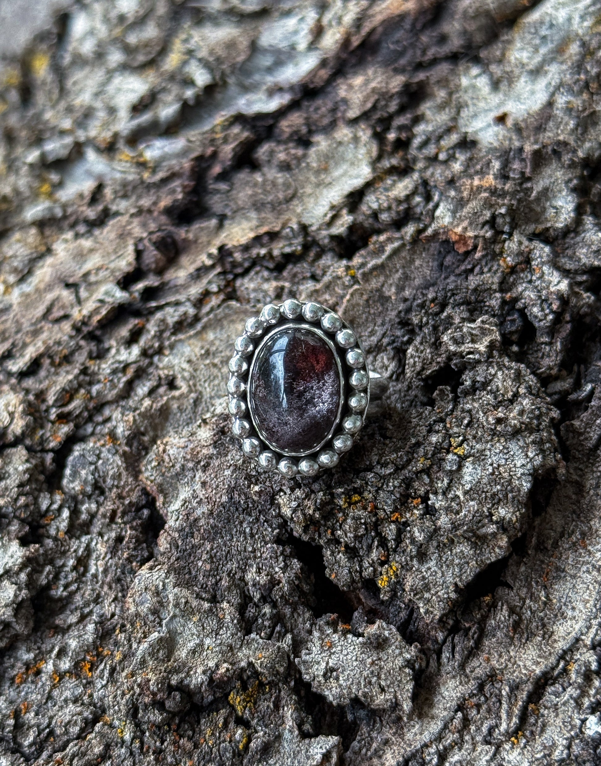 This ring features a two toned deep purple variety of garden quartz in a hand fabricated setting with beaded wire embellishments. Garden quartz is often associated with transformation, clarity, and spiritual growth.